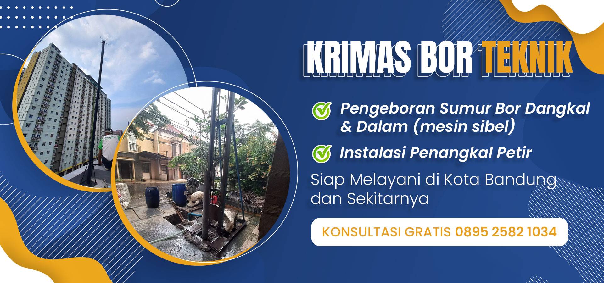 Krimas Bor Teknik merupakan penyedia jasa pengeboran sumur dan pemasangan penangkal petir di Kota Bandung. Kami siap melakukan pengeboran sumur dan instalasi penangkal petir ke lokasi anda di wilayah Kota Bandung, Cimahi dan sekitarnya. Krimas Bor Teknik sudah memberikan pelayanan lebih dari 8 tahun dan sudah di percaya mengerjakan lebih 100+ pengerjaan.